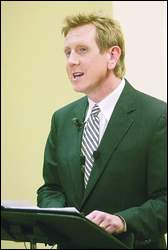 Pastor Jay Dennis of First Baptist Church at the Mall in Lakeland talks about the arrest of Marshal Seymour on Saturday. Seymour turned himself in to police. [Photo by David Mills, The Ledger] |
